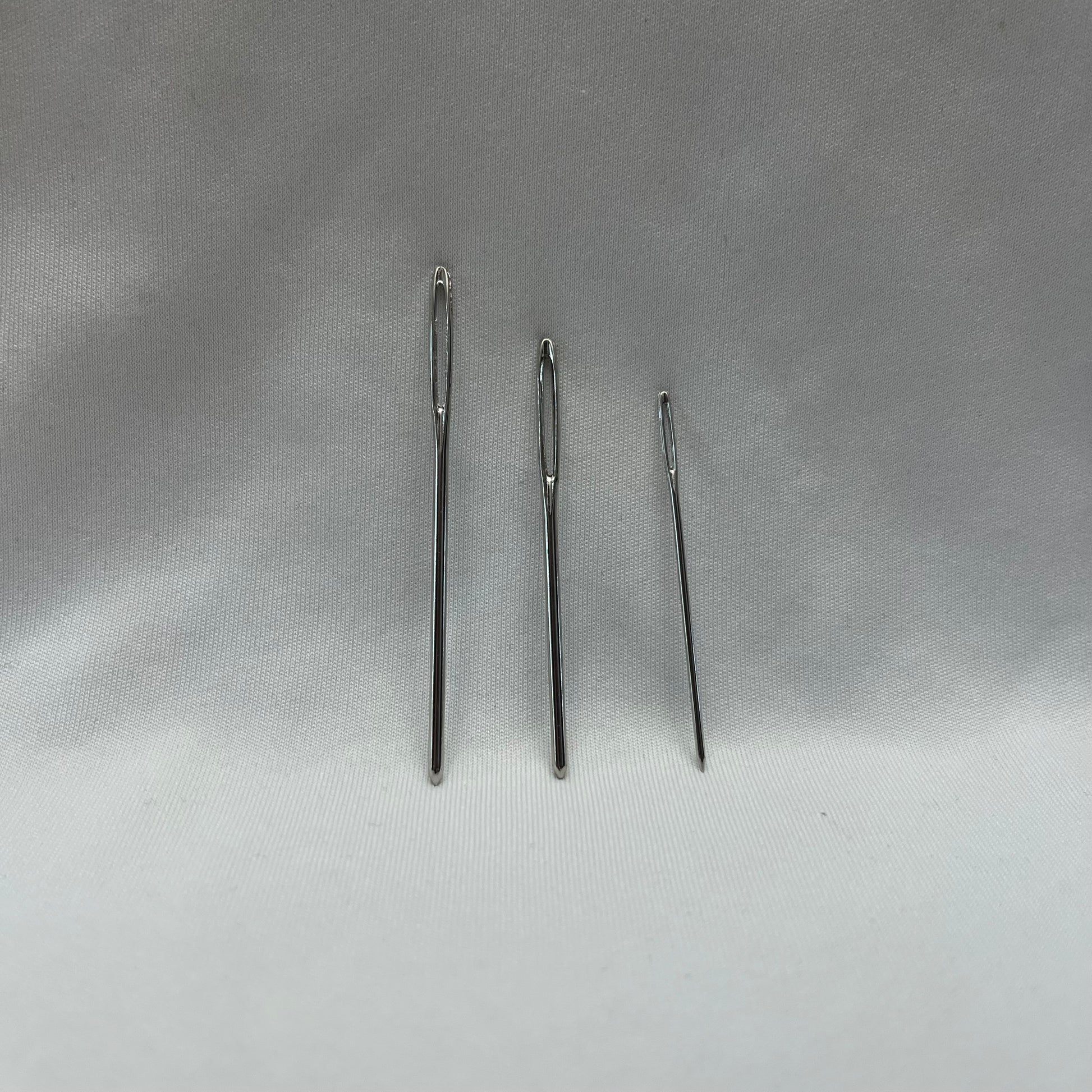 Metal, large-eye, blunt-tip darning (or yarn) needles. This comes with 3 different sizes: a 2inch/5.3cm, a 2.3inch/6cm, and a 2.7inch/7cm length.