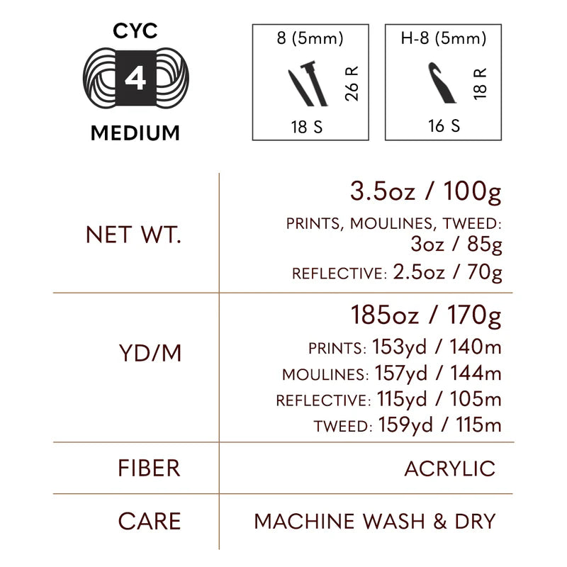 Worsted weight (#4) yarn made from 100% acrylic. Yarn is machine washable and dryable. 185 yards.