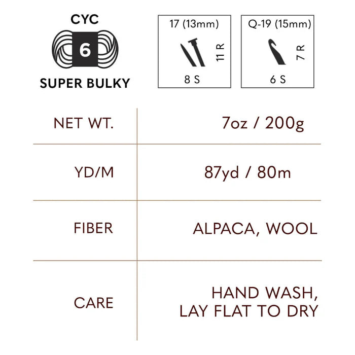 Super bulky weight (#6) yarn made from 50% alpaca and 50% wool. Hand wash and lay flat to dry. 87 yards.