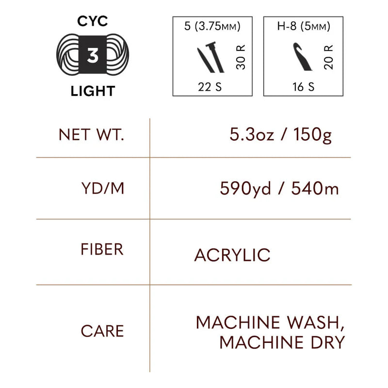 DK weight (#3) yarn made from 100% acrylic. Yarn is machine washable and dryable. 590 yards.