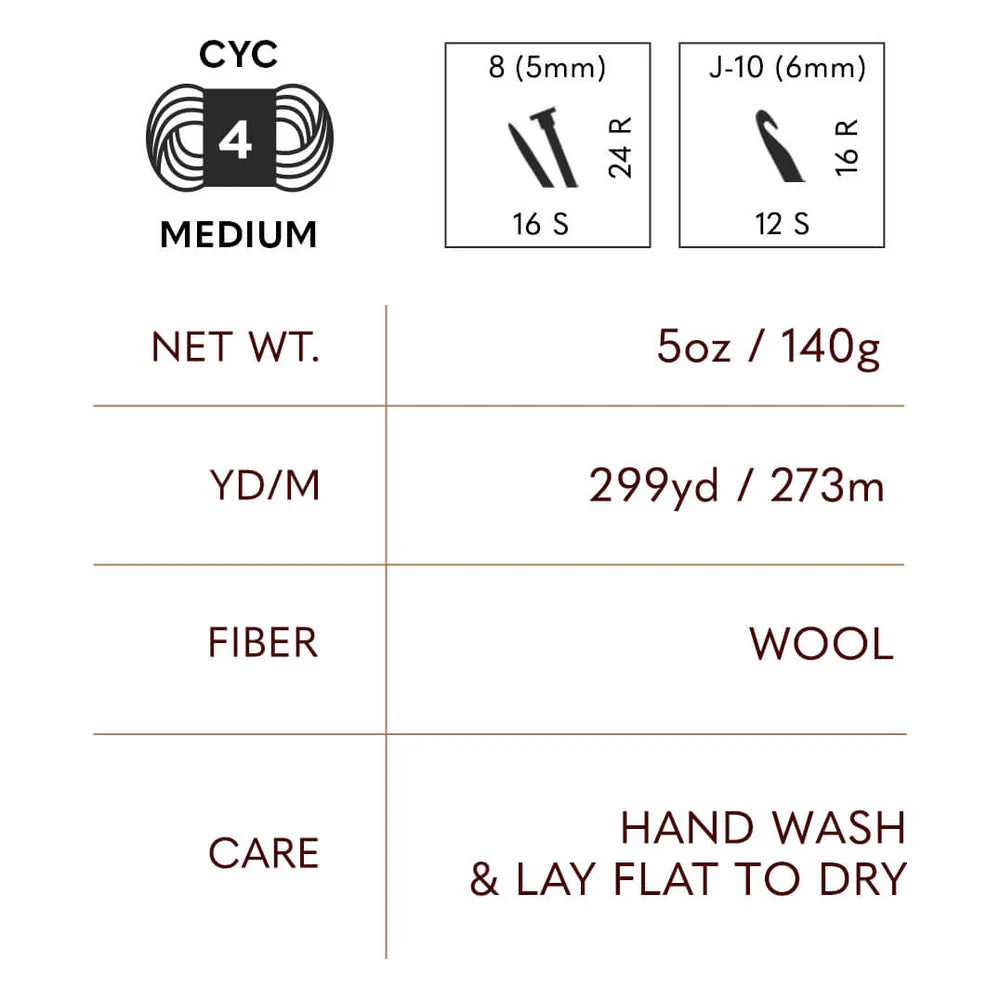 Worsted weight (#4) yarn made from 100% wool. Hand wash and lay flat to dry. 299 yards.