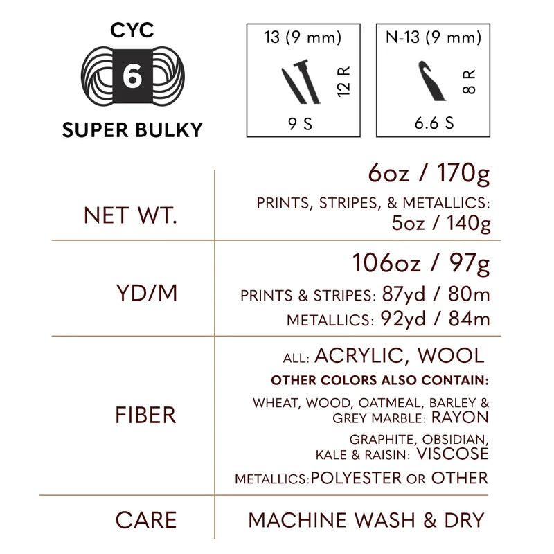 Super bulky weight (#6) yarn made from 80% acrylic, 20% wool. Machine wash and tumble dry. 106 (170g) yards.